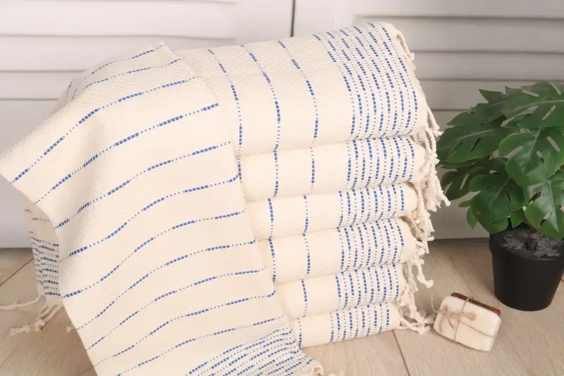 Organic Turkish cotton ensures exceptional absorbency and durability. Each towel measures precisely 36x18 inches or 45x90 cm, weighing 140 grams, with tolerances of 1-2.5 cm in hand-weaving. Customization involves embroidery and monogramming, allowing personalization of initials or logos. Pre-shrunk towels are shipped via DHL Express, FedEx, and UPS, with international delivery taking 2-5 days. Returns and exchanges are accepted within 7 days, with shipping costs borne by the buyer.