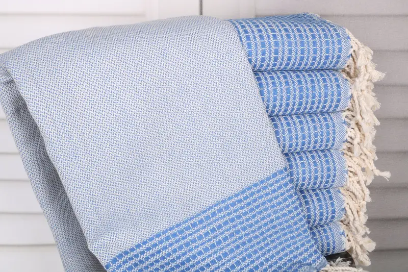 Organic Turkish cotton towels are known for their exceptional absorbency and durability, ensuring long-lasting use. Each towel is characterized by its high-quality fiber composition, resulting in both softness and robustness. Weighing 420 grams, these towels measure 36x69 inches or 90x175 centimeters, with a tolerance of 1-2.5cm due to hand-weaving techniques.