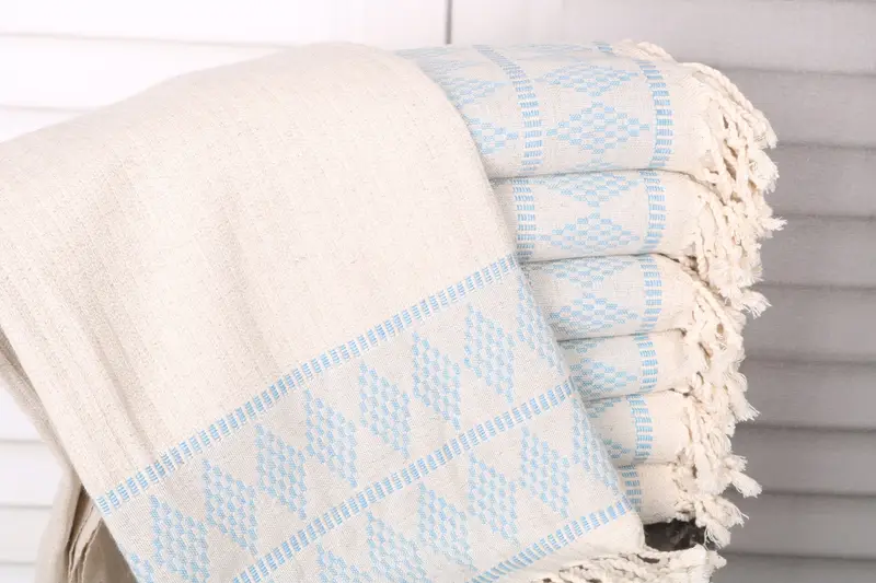 Organic Turkish cotton or natural linen bath towels are meticulously crafted to ensure superior absorbency and durability. These towels measure 36x71 inches or 90x180 cm, with a weight of 480 grams, providing a balance of comfort and utility. Dimensional variations of 1-2.5cm may occur due to hand-weaving.