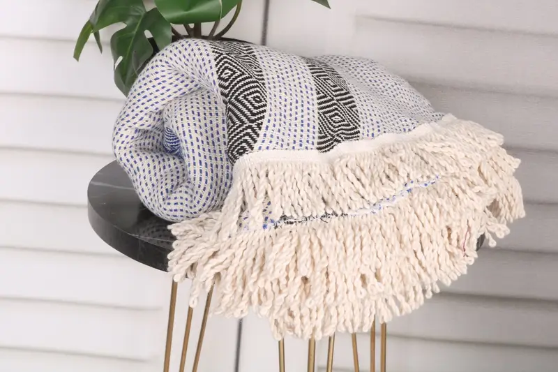 Characterized by its organic Turkish cotton composition, the beach towel ensures superior absorbency and durability. Resulting in a weight of 640 grams, the towel dimensions are precisely 63x63 inches or 160x160 cm, with a tolerance of 1-2.5 cm due to hand-weaving.