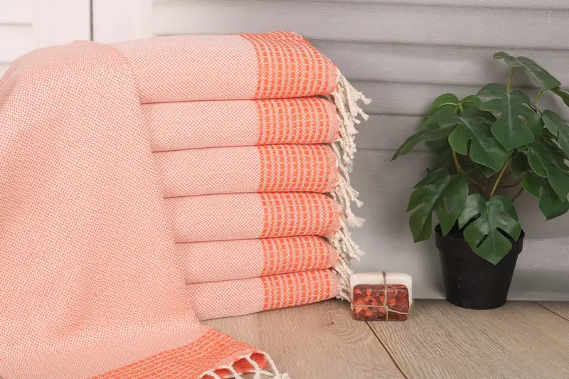 The Orange Striped Turkish Cotton Hand Towel is characterized by its organic Turkish cotton material, ensuring a high level of absorbency and durability. Resulting in a weight of 120 grams, the towel measures 40x20 inches or 50x100 cm, offering a well-balanced size for various uses.