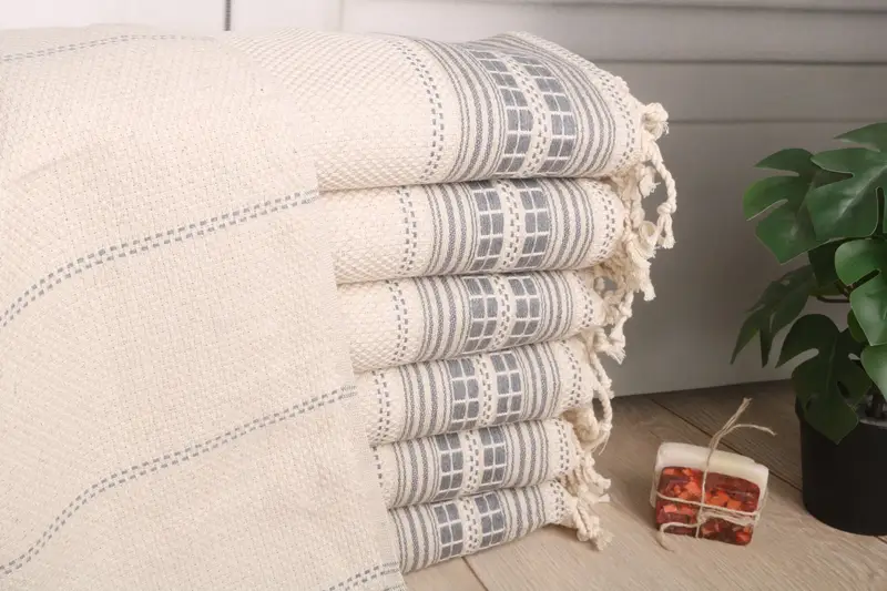 Organic Turkish cotton, if available, ensures superior absorbency and a soft texture. The towels are made from natural linen, resulting in a breathable and durable product. Each towel measures 40x20 inches or 50x100 cm, weighing 120 grams. Hand-weaving tolerances are between 1-2.5 cm.