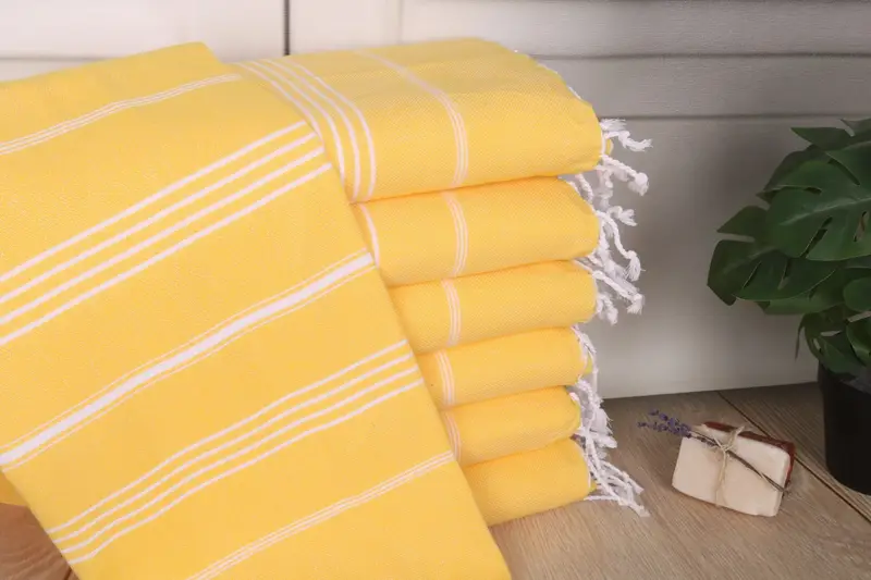 The 40x71 inches yellow cotton towel is characterized by its composition of organic Turkish cotton or natural linen, ensuring a high level of absorbency and sustainability. These towels, available in either 70x40 inches or 100x180 cm, maintain a weight of 280 grams and are hand-woven with a tolerance of 1-2.5 cm. Customization options include personalization through embroidery or monogramming, allowing for precise placement of letters, initials, or logos as per customer preference.