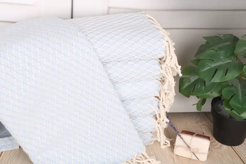 Composed of organic Turkish cotton or natural linen, the towel ensures superior absorbency and softness. Characterized by a 40x67 inches dimension, equivalent to 100x170 cm, it weighs 380 grams. The hand-weaving process allows for a tolerance of 1-2.5cm in the dimensions, ensuring a personalized fit.