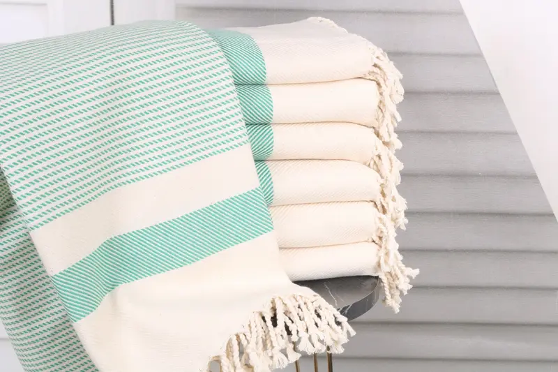These towels are characterized by their composition of organic Turkish cotton or natural linen, ensuring superior absorbency and durability. With dimensions of 40x71 inches or 100x180 cm, each towel weighs 400 grams, providing a balance between lightweight convenience and substantial material. Hand-weaving tolerances allow for variations within 1-2.5 cm in measurements, ensuring precision despite artisanal methods.