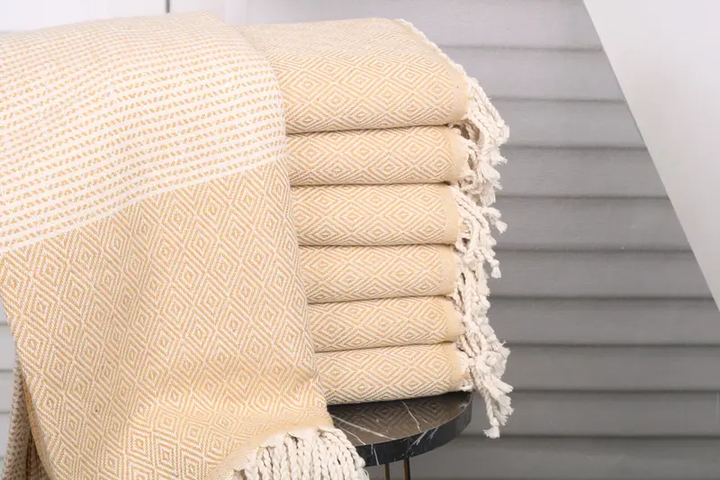 Characterized by their high absorbency, these towels are crafted from organic Turkish cotton or natural linen, ensuring optimal water absorption and durability. Resulting in a lightweight yet sturdy product, the towels measure 40x71 inches or 100x180 cm, and weigh 410 grams, providing a perfect balance of size and utility. Each towel is meticulously designed with a tolerance of 1-2.5 cm for hand-weaving, contributing to their unique and artisanal quality.