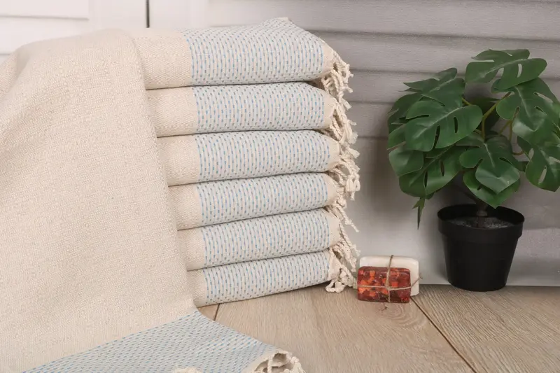 The dish towel is characterized by its composition of organic Turkish cotton or natural linen, ensuring high absorbency and durability. Measuring 40x20 inches or 50x100 centimeters, the towel weighs 120 grams and features tolerances of 1-2.5cm in weaving.