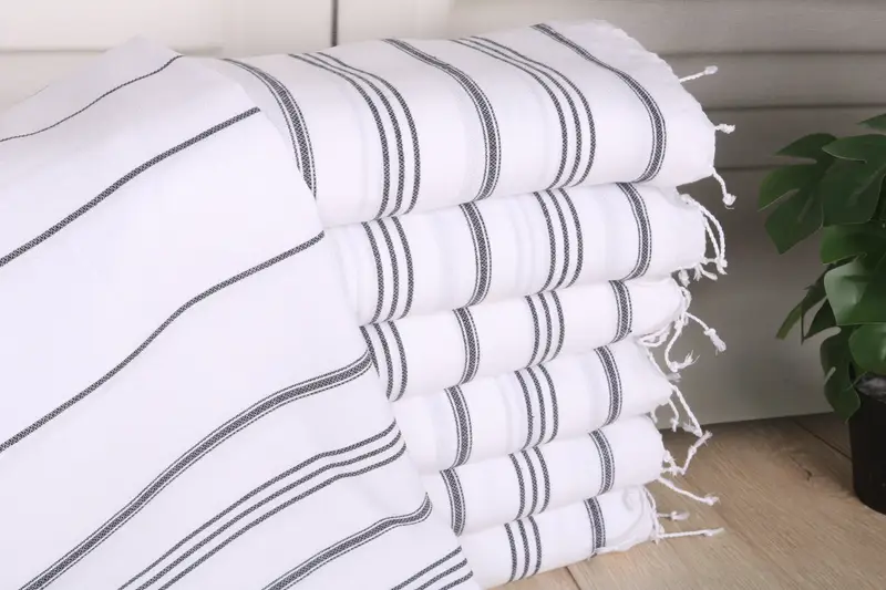 Turkish hand towels are distinguished by their use of organic Turkish cotton, characterized by superior absorbency and durability. The towels are available in sizes 40x24 inches or 60x100 cm, with a weight of 100 grams. Fabric consistency ensures tolerances of 1-2.5cm in hand-weaving, maintaining a premium product standard.