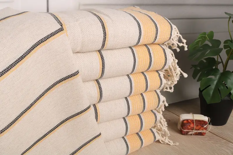 Characterized by its lightweight nature, the 20"x40" Mustard Linen Tea Towel is crafted from organic Turkish cotton or natural linen, ensuring enhanced absorbency. The towel's dimensions are 40x20 inches or 50x100 cm, with a weight of 120 grams, offering comfortable utility with minimal bulk. The hand-weaving process permits tolerances between 1-2.5 cm, providing consistency in each product.