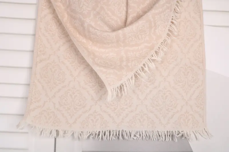 The 24"x40" beige cotton dish towel is crafted from organic Turkish cotton or natural linen, ensuring durability and eco-friendly attributes. Its weight of 120 grams is indicative of its substantial density, resulting in effective absorbency and longevity. Measuring precisely at 40x24 inches or 60x100 cm, this towel exhibits a margin of error of 1-2.5 cm due to hand-weaving tolerances.