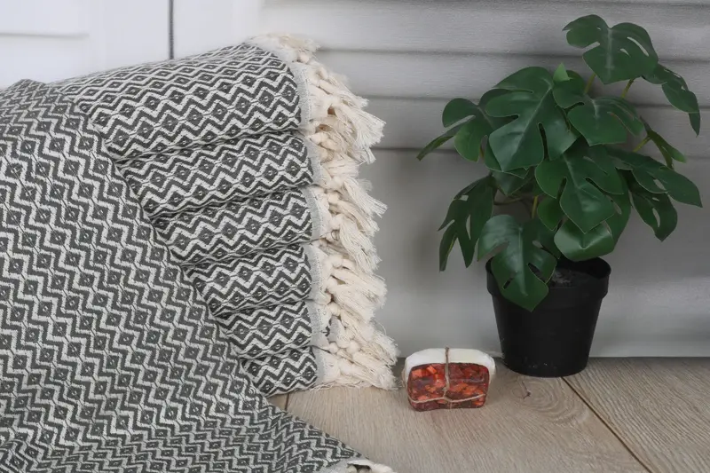 This product is characterized by its fiber composition, primarily Turkish cotton, ensuring exceptional absorbency and durability. Measuring 70x40 inches or 180x100 cm, the towel weighs approximately 400 grams, allowing for a balance between portability and utility. The hand-weaving process introduces a tolerance of 1-2.5 cm in measurements, ensuring artisanal quality.