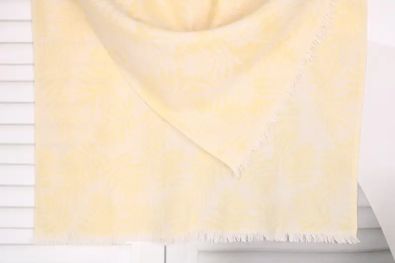 Fabulous fabric, color almost like in the image, very slightly less yellow, a tad more ocre. Unfortunately, zero loop (or tab or anything to hang these) beautiful pieces of towel on. Otherwise perfect and lovely to hang over a chair etc. Came with an extra gift towel.