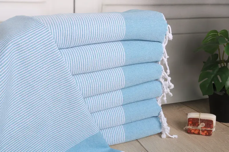 The 18"x40" turquoise cotton hand towels are crafted from organic Turkish cotton, ensuring superior absorbency and durability. Characterized by their lightweight nature, each towel weighs 100 grams, providing an ideal balance of comfort and functionality. The towels feature precise dimensions of 40x18 inches or 45x100 cm, with allowable hand-weaving tolerances of 1-2.5 cm.