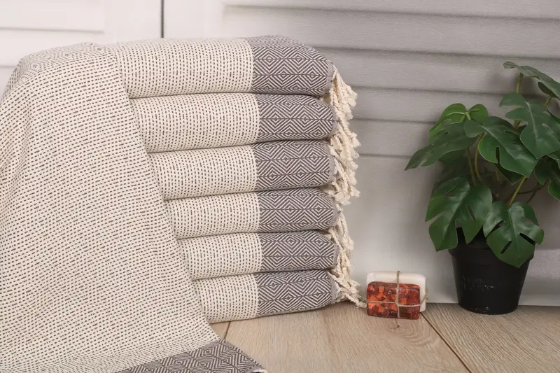 Characterized by its organic Turkish cotton composition, the Diamond Brown Cotton Turkish Towel ensures superior absorbency and durability, promoting an optimal experience for diverse uses. Measuring 36x18 inches (45x90 cm) with a weight of 122 grams, this towel is meticulously crafted, allowing for minor hand-weaving tolerances of 1-2.5 cm. The pre-shrunk status of the towel results in minimal dimensional changes post-wash, maintaining its structural integrity.