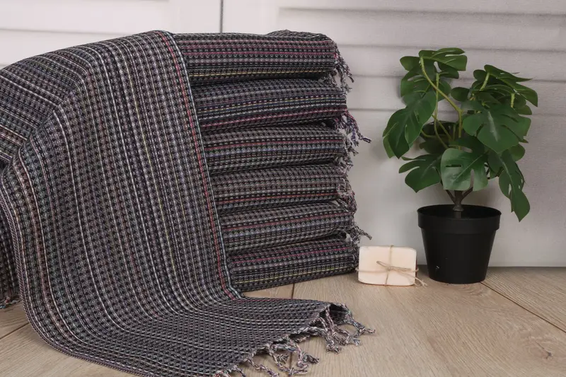 Organic Turkish cotton, if specified, ensures superior absorbency and softness. Characterized by its lightweight properties, this material results in a lightweight towel of 120 grams, facilitating ease of use and portability. Measuring 38x18 inches or 45x95 cm, and considering a hand-weaving tolerance of 1-2.5cm, the towels provide precise dimensions for varied uses.