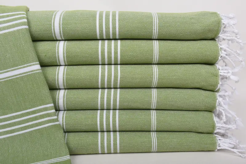Characterized by 100 percent organic cotton, the Turkish towels exhibit superior absorbency. The towels measure 70x40 inches or 180x100 centimeters, weighing approximately 280 grams. The hand-weaving process may result in size tolerances of up to 2.5 centimeters.