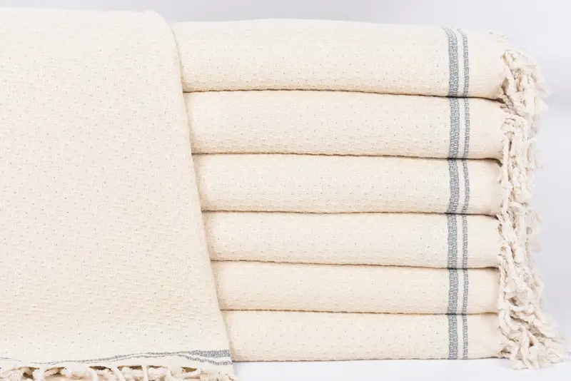 Comprised entirely of 100 percent organic cotton, the towels ensure superior absorbency and sustainability. Resulting in a soft and durable product, the material's fiber composition contributes to its high-quality hand-weaving standards. Characterized by dimensions of 67x36 inches or 170x90 cm, these towels weigh 440 grams, allowing for a lightweight yet robust texture. Weaving tolerances range from 1-2.5 cm, ensuring each piece meets precise standards.