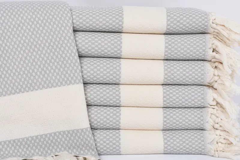 Turkish Towels are characterized by their material composition of 100% organic cotton, ensuring high absorbency and durability. Resulting in towels that are lightweight, measuring 67x36 inches or 170x90 cm, weighing 320 grams or 11.3 ounces. Weaving tolerances may result in slight variations of up to 1-2.5 cm in size.