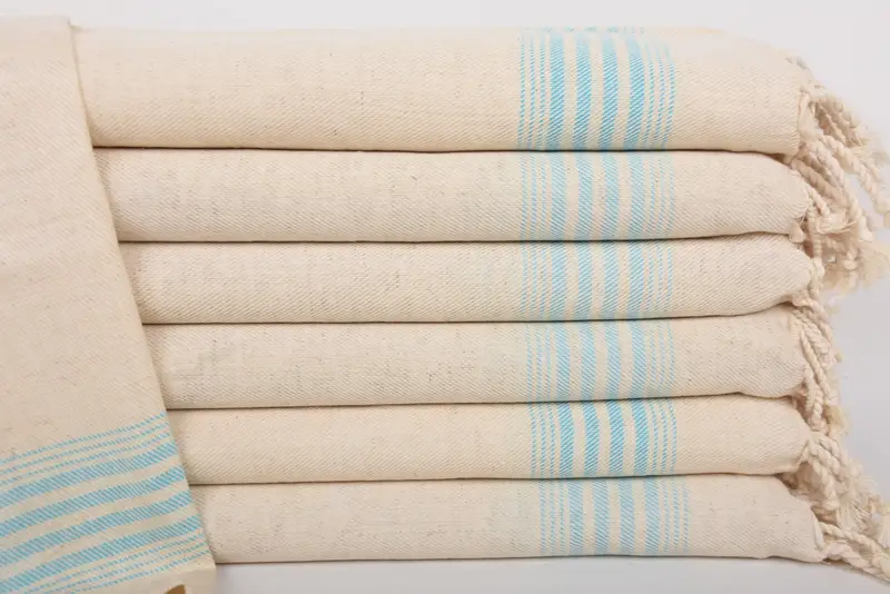 The hand towel is characterized by its composition, featuring 100% organic cotton material, ensuring high absorbency and eco-friendliness. Dimensions are precisely 36 inches by 18 inches (90 cm by 45 cm), with a tolerance of 1-2.5 cm due to hand-weaving techniques. Weight of the towel stands at 104 grams (3.7 ounces).