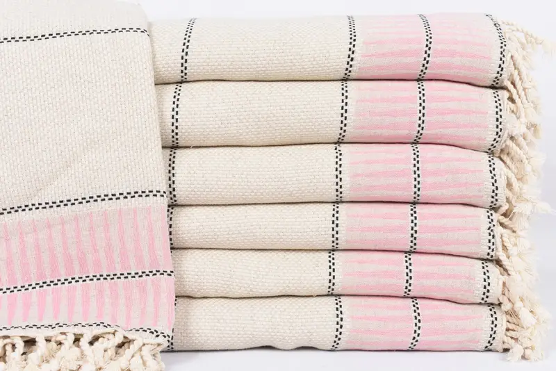 Turkish blankets, particularly the Turkish Throws, are characterized by their 100 percent natural linen material, ensuring breathability and sustainability. Measuring 103x95 inches or 260x240 cm, these blankets weigh approximately 1350 grams or 47.6 ounces. The weaving process results in a tolerance of 1-2.5 cm, providing slight size variations.