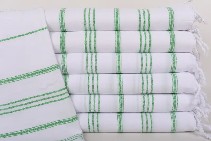 The 40"x24" Green Striped Tea Towel is characterized by its material composition, consisting entirely of 100 percent Organic Cotton, ensuring breathability and absorbency. The dimensions of the towel are 100x60 cm, with slight variations within a 1-2.5cm tolerance due to hand-weaving techniques, and a weight of 100 grams or 3.5 ounces. Customization options include personal embroidery, allowing for monograms to be added, enhancing the utility and sentimental value of the product.
