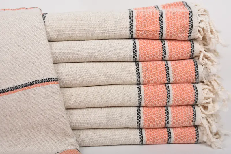 The beach towel is woven from 100 percent natural linen, ensuring both eco-friendliness and durability. Characterized by its vibrant orange hue with white stripes, it measures 70x36 inches or 180x90 centimeters, weighing 430 grams. Variations of 1-2.5 centimeters may occur due to hand-weaving.