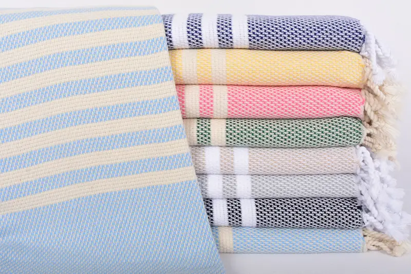Turkish Towel is characterized by its 100 percent organic cotton composition, ensuring both sustainability and superior absorbency. The towels exhibit a 67"x40" (170x100 cm) dimension with a weight of 380 grams, offering a substantial size for various uses. Each piece is handcrafted with tolerances of 1-2.5 cm due to traditional weaving techniques.