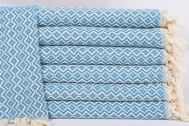 Turkish cotton towels are characterized by their 100 percent organic cotton material, ensuring maximum absorbency and durability. The towels are 36x18 inches (90x45 cm) in dimension, weighing approximately 120 grams or 4.2 ounces. Hand-weaving results in a tolerance of 1-2.5 cm in size.