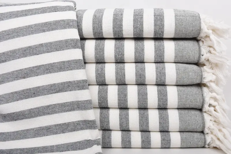 Constructed from 100 percent organic cotton, the towels ensure superior absorbency and eco-conscious luxury. Resulting in a lightweight towel, the material weight is precisely 422 grams, providing an airy yet robust texture. Each towel is meticulously hand-woven in Turkey, with dimensions of 67x40 inches or 170x100 centimeters, allowing a slight variation of 1-2.5 cm due to artisanal weaving.
