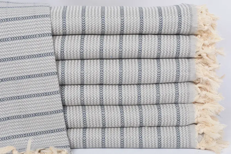 The beach towel is crafted from 100 percent organic cotton, ensuring high-quality absorbency and durability. Characterized by a light gray to dark gray striped pattern, it measures 70x40 inches or 180x100 centimeters. The hand-woven dimensions allow for a tolerance of up to 1-2.5 centimeters.