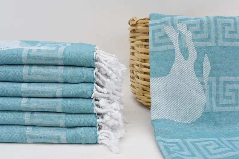The Petrol Green Towel embodies a Turkish Peshtemal Towel, characterized by its 100% natural cotton composition, ensuring excellent absorbency and a luxurious feel. The towel measures 70 x 40 inches or 180 x 100 cm, with a tolerance of 1-2.5 cm in hand-weaving, ensuring precise dimensions that might vary slightly due to artisanal craftsmanship. Shipments originate from Turkey for larger orders, while smaller orders may ship from a US-based warehouse, offering expedited delivery through DHL Express or FedEx, with a maximum delivery time of three...