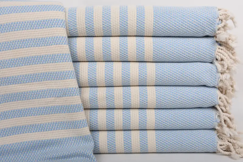 Turkish cotton towels are fabricated from 100 percent organic cotton, ensuring superior absorbency and a delicate texture. These handmade beach towels measure 67 x 40 inches (170 x 100 cm) with a tolerance of 1-2.5 cm due to hand-weaving techniques. Each towel weighs approximately 380 grams, providing a balance between lightweight and durability.