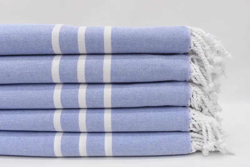 The Turkish towel is characterized by its material, comprising 100% natural cotton, ensuring excellent absorbency and durability. Each piece measures 70 inches by 40 inches, translating to 180 centimeters by 100 centimeters; variations up to 2.5 centimeters may occur due to hand-weaving techniques. The weight of the towel ranges between 300 and 400 grams, providing a balance of lightness and robustness.