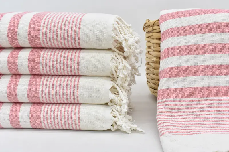 Characterized by its superior absorbency and softness, the Turkish bath towel is made from 100% natural cotton, ensuring a plush and durable material for everyday use. Measuring 66 inches by 40 inches, or 170 cm by 100 cm, the towel accommodates variations within a tolerance of 1-2.5 cm due to the traditional hand-weaving process, resulting in a weight between 14-16 ounces or 400-500 grams. The towel is pre-shrunk, which minimizes potential shrinkage after washing.