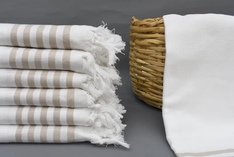 The Beige Travel Towel is made from 100% natural cotton, ensuring durability and softness. Characterized by its dimensions of 70x40 inches or 180x100 cm, the towel weighs between 10-13 ounces (300-400 grams). Slight variances may occur due to hand-weaving, up to 1-2.5 cm.