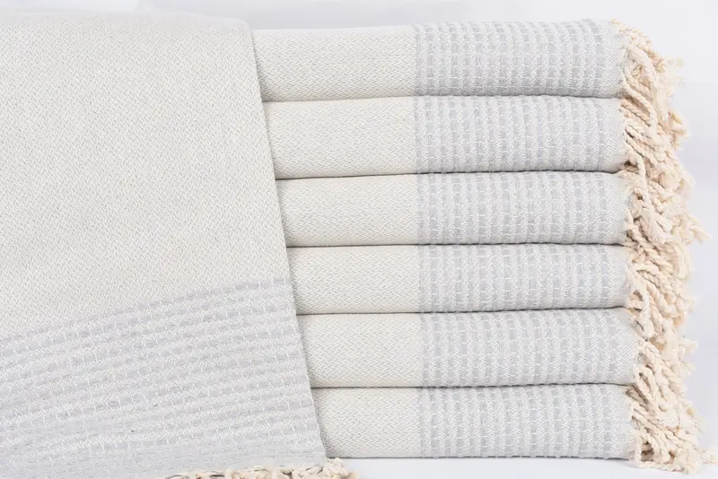 These towels are characterized by their 100 percent organic cotton composition, ensuring superior absorbency and softness. Each towel, hand-woven in Turkey, measures 69x36 inches or 175x90 cm, with a tolerance of 1-2.5 cm due to the weaving process. The weight of each towel is 420 grams, contributing to their plush texture.
