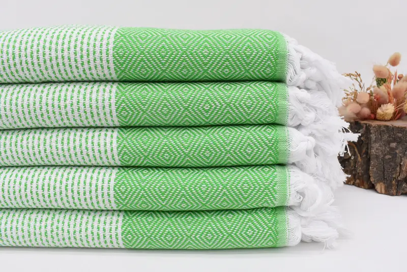 This handwoven Turkish towel is characterized by its 100% natural cotton composition, ensuring superior absorbency and a soft touch. The towel exhibits a primary green hue with accents of white, measuring 70 x 40 inches or 180 x 100 centimeters. It has a weight of 12-13 ounces (360-390 grams), with a weaving tolerance of up to 2.5 cm.