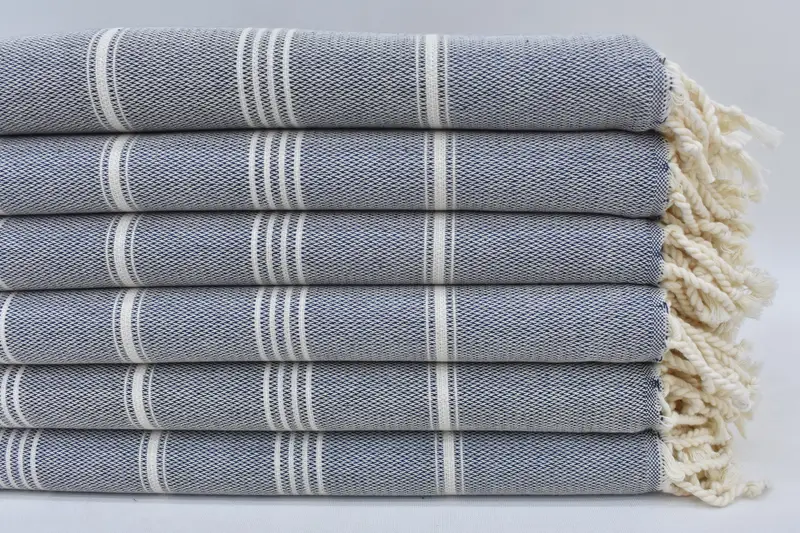 100% Natural Cotton composition ensures exceptional absorbency, resulting in a superior experience for Turkish Bath Towels. Characterized by dimensions of 70 inches x 40 inches (180 cm x 100 cm), the bath towels' weight ranges from 11 to 13 ounces (340-400 grams). Hand-weaving tolerances may cause minor variations, typically within 1-2.5 cm.
