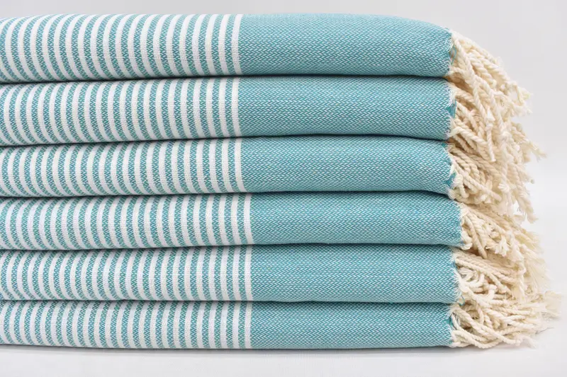 Specified by its petrol green primary color with white accents, the hand-woven fabric features a striped pattern. The meticulous weaving process results in a luxurious towel that meets the specific require...