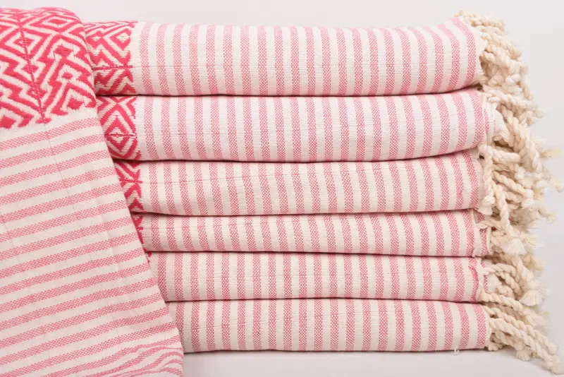 The Turkish Towel Beach Towel, sized at 75x38 inches, is characterized by its high absorbency and softness, resulting from 100% organic cotton material. Resulting in a product weight of approximately 400 grams, each towel ensures a comfortable and gentle handfeel. Tolerances in hand-weaving may result in dimensions varying by 1-2.5 cm.