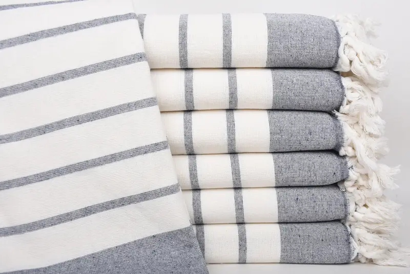 The 67"x39" Navy Striped Towel is made from 100% organic cotton, ensuring superior absorbency and softness. Characterized by dimensions of 170x98 cm and a weight of 422 grams, the towel's hand-weaving allows for variations of up to 1-2.5 cm in size.