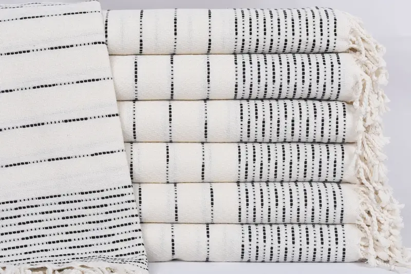 The Turkish towel is fabricated from 100 percent organic cotton, ensuring high absorbency and a soft texture. It has dimensions of 70x38 inches or 180x95 centimeters, with a weight of 420 grams or 14.8 ounces. Weaving tolerances may result in minor variations of up to 2.5 cm.
