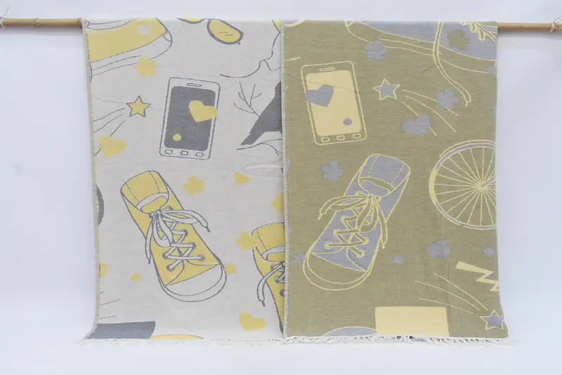 This throw blanket is composed of 100% natural cotton, ensuring a soft and breathable feel while providing warmth and comfort. The blanket features a bright yellow primary color and a white secondary color, making it suitable for a variety of decor styles. Dimensions are 94 x 78 inches (240 x 200 cm), with a weight range of 1100-1200 grams (36-40 ounces), offering a moderate yet cozy covering.