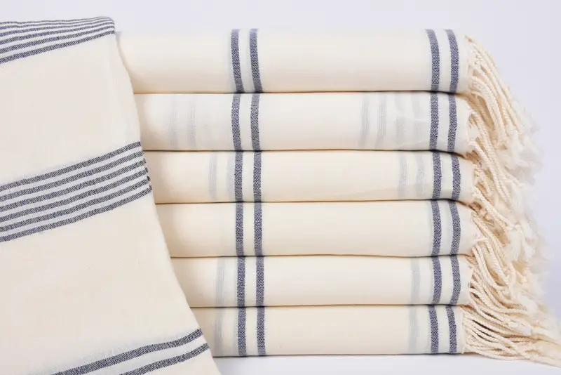 These beach towels are characterized by their high-quality, 100 percent organic cotton material, ensuring superior absorbency and comfort. The towels are meticulously hand-woven in Turkey, resulting in a size of 70x36 inches or 180x90 cm, with minor variations of 1-2.5 cm due to the weaving process. Weighing 290 grams (10.2 ounces), these towels are robust and suitable for various uses.
