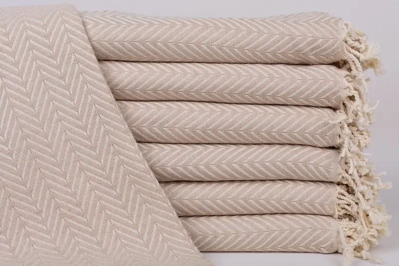 Characterized by high absorbency, the 70"x40" beige zig zag towel is crafted from 100 percent organic cotton, ensuring excellent moisture retention and softness. The towel's dimensions are 70x40 inches or 180x100 cm, with a weight of 420 grams or 14.8 ounces. Due to the hand-weaving process, there might be slight variations of up to 2.5 cm in size. Resulting in personalized gifts, the towels offer customization options for embroidery, allowing for monograms and names to be added. Pre-shrunk, these towels are ready for immediate use. DHL Express...