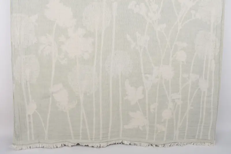 The blanket is characterized by its 100% organic cotton construction, ensuring hypoallergenic properties and optimal absorbency. Dimensions of the throw measure 91x83 inches or 230x210 centimeters, with a weight of 900 grams or 31.7 ounces. Hand-weaving results in a tolerance of approximately 1-2.5 centimeters in size.
