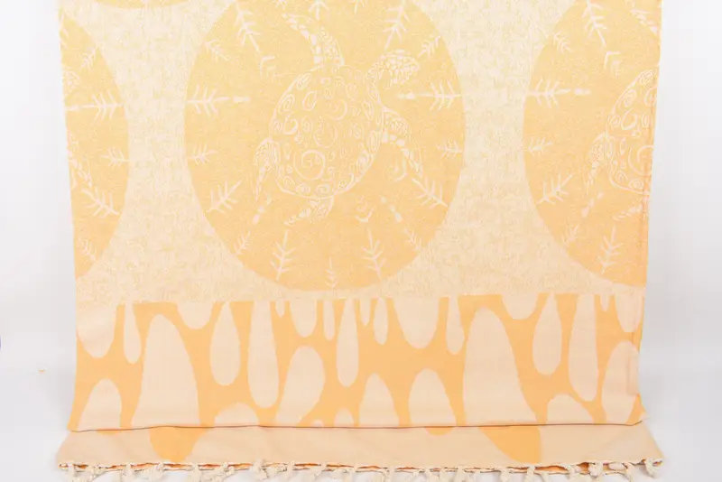 The tablecloth is characterized by a 99"x79" dimension and a weight of 1250 grams, crafted from 100% organic cotton, ensuring high absorbency and breathability. Resulting in a size tolerance of 1-2.5cm due to hand-weaving, it measures 250x200 cm, offering versatile use as a blanket or beach throw. Custom embroidery options are available for personalizing guest names or special dates, enhancing its utility as a throw or tablecloth while pre-shrunk for durability.