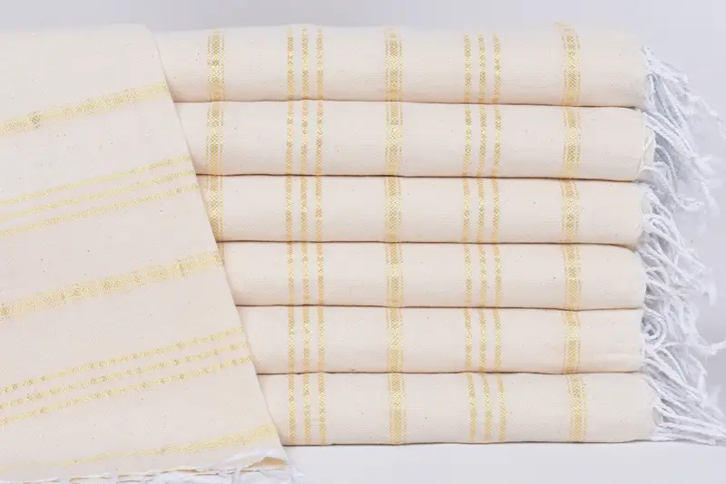 The towels exhibit precise dimensions of 36 x 22 inches or 90 x 55 cm, with a tolerance of 1-2.5 cm due to hand-weaving. The towels, weighing approximately 90 grams or 3.2 ounces, provide lightweight yet sturdy functionality.
