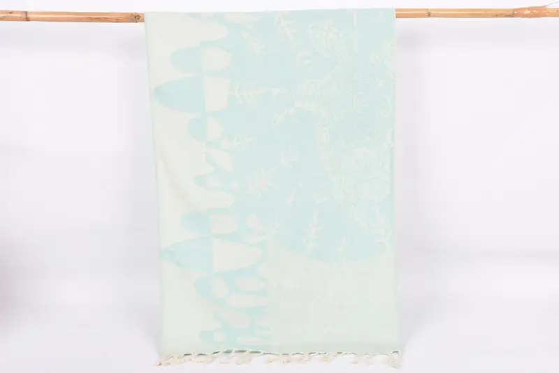 Characterized by its pure organic cotton composition, the hand towel offers high absorbency and durability. Ensuring gentle care for skin, the 100 percent organic cotton fiber provides a soft texture. Weighing 120 grams and measuring 36 x 18 inches or 90 x 45 cm, the towel exhibits a slight variance in size due to the hand-weaving process.