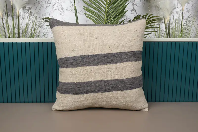 Almohada de tiro a rayas beige y gris, cojín vintage bordado